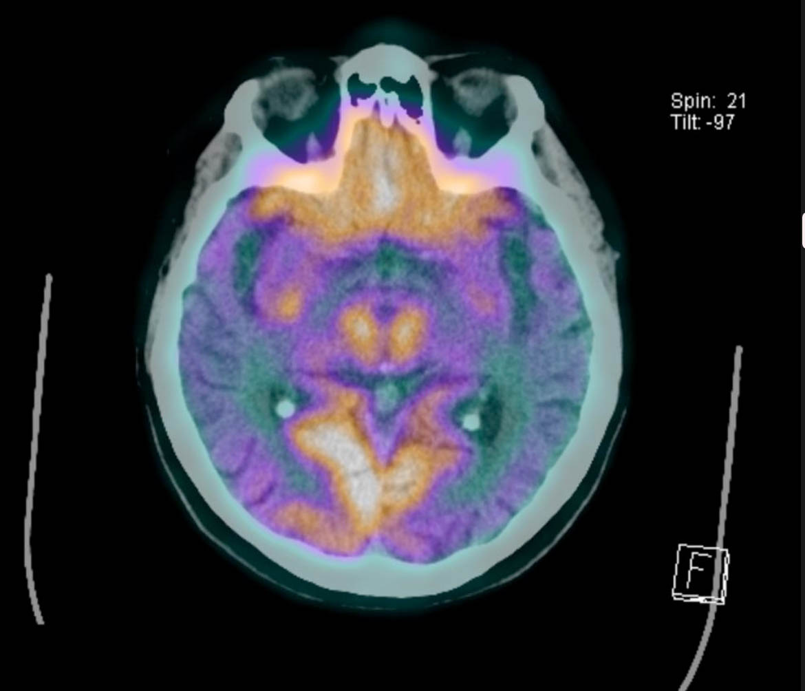 Imagen de PET-CT en enfermo con Alzheimer en que las zonas de color naranja son normales, pero extensas zonas de su corteza cerebral no se aprecian